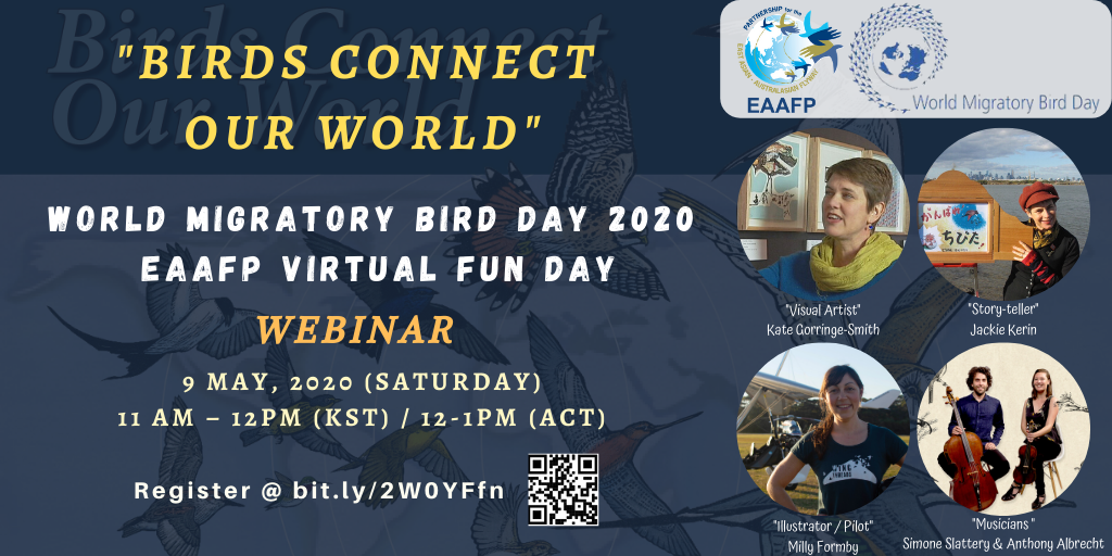 2020 세계 철새의 날 주제는 “세계를 이어주는 철새들” 입니다. 동아시아-대양주 이동경로의 철새들과 이어질 수 있는 연결고리를 EAAFP가 준비한 온라인 공연으로 함께 만들어보세요!