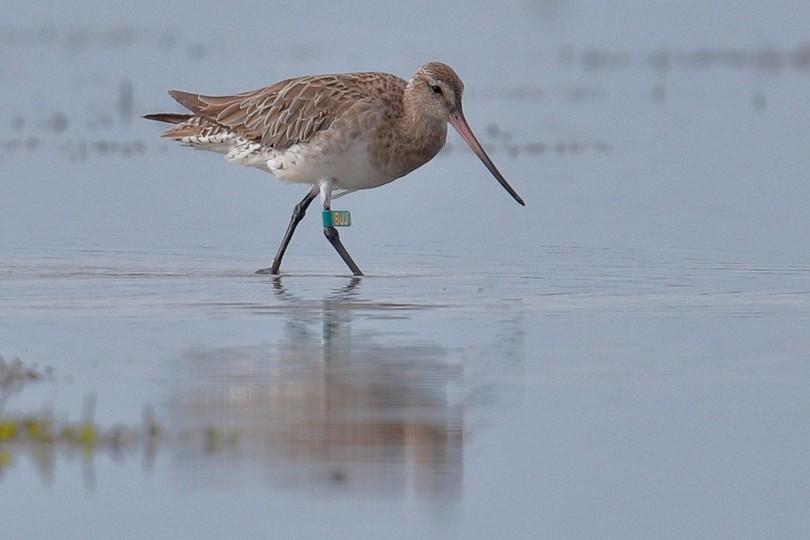 | Caption: “This bird is known as 5RYBR and had been missing in action since 24 March 2020 when she was seen leaving New Zealand. She was first metal banded in 2010 and colour-banded in 2013. She has been noted leaving on migration each year since in New Zealand but hasn’t been recaught to allow the information to be downloaded from the Geotag. It was my great pleasure to photograph her amongst hundreds of other Bar-tailed Godwits this day and to let New Zealand know their bird was alive and well.” | |