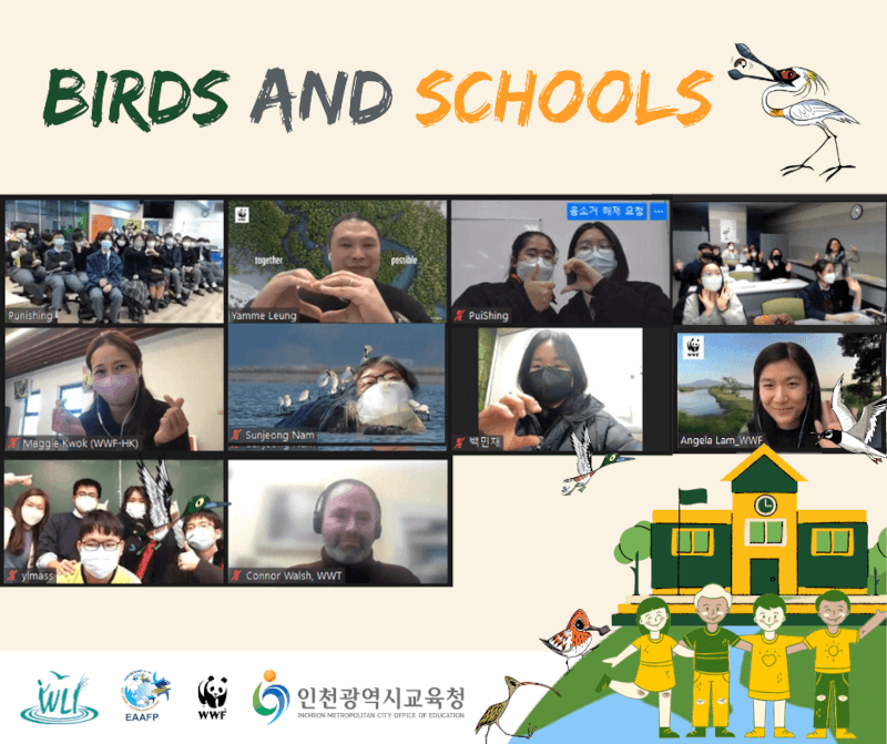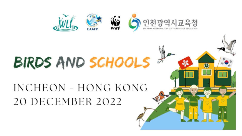 2022년 12월 20일, EAAFP 사무국과 세계자연보호기금(WWF) 홍콩, 인천광역시교육청이 주최한 ‘새와 학교’의 첫 행사가 열렸다. 이 행사는 또한 인천-홍콩 자매서식지 프로그램에 의해 진행되었다. 이번 하이브리드 행사에는 대한민국 인천광역시 중·고등학교 학생 3명(인천 하늘고, 인천 남동중, 인천고), 홍콩 중학교 학생 2명(푸이싱가톨릭중, 원랑상회중)이 함께 했다.