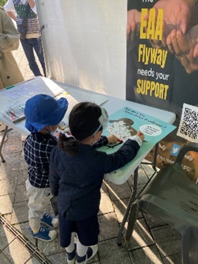 The visitors, most of whom were families with young children, were able to learn which cities Black-faced Spoonbill (BFS) migrate to by playing a modified treasure hunt version of the BFS Lolo game. For the game, participants had to find five migration location cards, which were hidden around the bird fair grounds and other booths, to receive a small gift. To make the game more interesting, the Secretariat cooperated with booth operators from Japan, Taiwan and Hong Kong SAR to hide the location cards for Kyushu, Taipo and Maipo in their respective booths. Younger participants could also color in shorebirds and leave messages for migratory waterbirds at the booth.