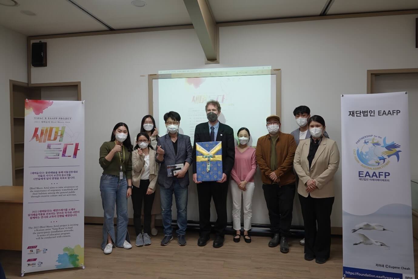 With a series of education programs and an exhibition to come, the 2022 Bird Meets Arts will invite Mr. Yang Kura, who is a well known installation artist inspired by various environmental issues, especially marine waste. In the first lecture on 18th May, Yang Kura, and Vivian Fu, the Communication Officer of EAAFP Secretariat gave a talk to the citizens of Incheon.