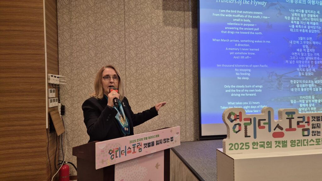 At the forum, Jennifer George, Chief Executive of the EAAFP Secretariat, and Minjae Baek, Communications Officer, delivered a thematic lecture on the conservation of migratory waterbirds in the Yellow Sea tidal flats. The lecture highlighted the critical role that tidal flats play in supporting migratory waterbirds along the East Asian–Australasian Flyway. This was followed by an interactive session in which participants exchanged ideas and perspectives with Jennifer George and Yoon Lee, Deputy Chief of the Secretariat.