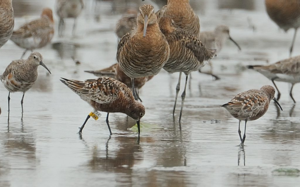 Curlew Sandpiper with white over yellow leg flags indicate it was ringed in Hong Kong © Kevin Lok