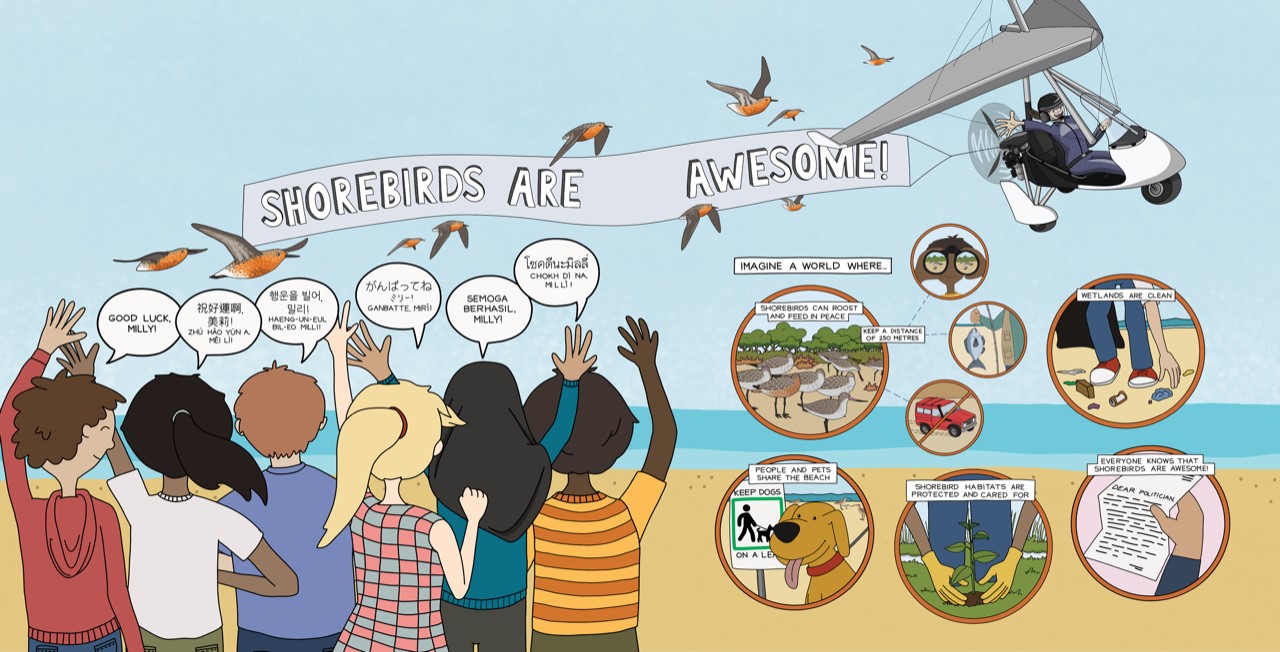 Milly will be taking off in her microlight on a real flying adventure around Australia in mid-2022. On the way, she will be visiting schools, libraries and wetland centres and spreading the shorebird word. Milly invites you all, wherever you are on the East Asian-Australasian Flyway, to follow along and learn together. Let’s tell everyone why shorebirds are totally awesome!