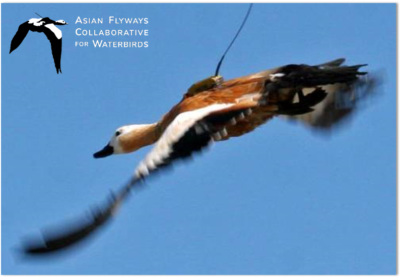 Ruddy Shelduck in flight with transmitter attached © Nyambayar Batbayer