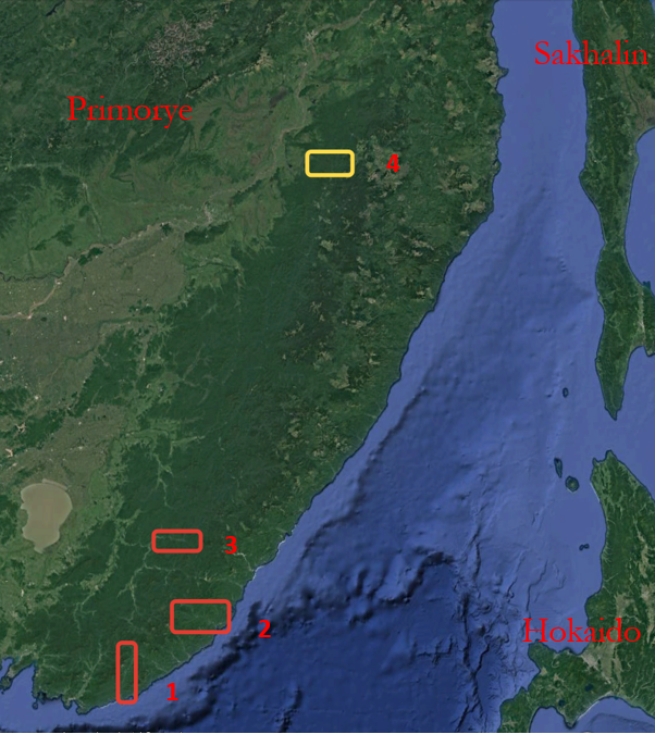Figure 1. Map of four existing incubators for the Scaly-sided Merganser: 1- Kievka R basin; 2- Avvakumova R; 3- Zhuravlevka R basin and 4 – Anuy R within Anuyskiy National Park.