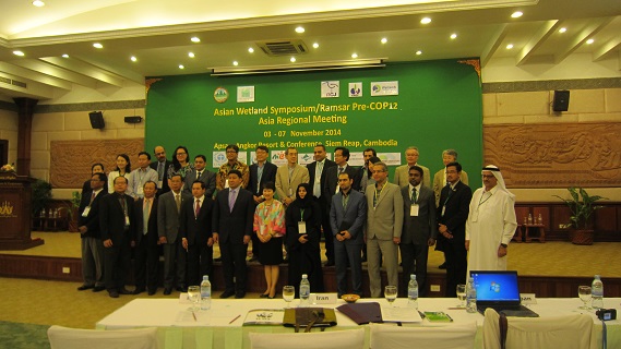 The Asian Wetland Symposium (AWS) was held together with the Ramsar Pre-COP12 Asia Regional Meeting (RARM) on 3-7 November 2014 in Siem Reap, Cambodia, hosted by the Government of the Kingdom of Cambodia, the Ramsar Convention Secretariat, Wetlands International Japan and Ramsar Center Japan. The AWS provides an opportunity for discussions among various sectors who are engaged in wise use of wetlands in Asia. The RARM is an opportunity to review progress on implementing the Ramsar Convention, and also allows discussion and development of regional inputs into the Draft Resolutions prior to the next Conference of Parties (COP), which will take place in Uruguay in June 2015. In this joint meeting, 170 participants including 33 Ramsar National Focal Points from the Asia region participated to share issues and best practices on wetlands and wetland conservation, and developed and discussed draft resolutions.