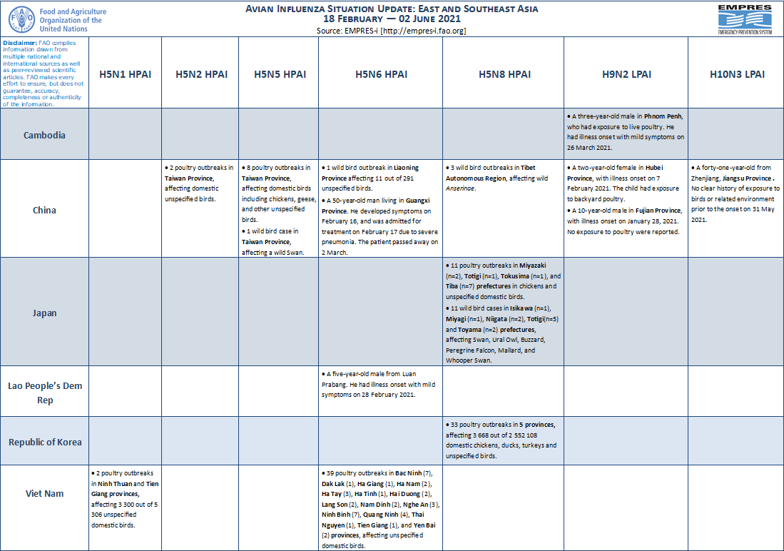 Avian Influenza in East and Southeast Asia from 18 February to 02 June 2021 ©EMPRES-i
