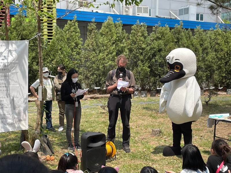 Mr. Doug Watkins, Chief Executive of EAAFP, gave congratulatory remarks at the BFS Birthday Party, and highlighted the importance of BFS, BFS’s adaption to the newly constructed artificial habitat, and EAAFP’s work in the conservation of the endangered species. He shared his hope to work together with the local communities for the better management of the BFS habitats before the closing of the event. The event ended with an exuberant sing-along of a song dedicated to BFS nesting in Namdong reservoir.