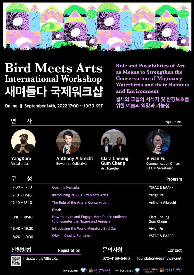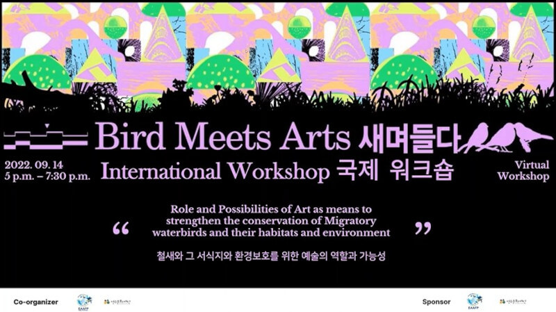 On September 14th, 2022, <Bird Meets Arts> online international workshop was completed. This workshop concluded the <Bird Meets Arts> series, with the workshop focused on discussing the role and possibilities of art as means to strengthen the conservation of migratory waterbirds and their habitats. Four environmental artists from Ro Korea, Australia and Hong Kong, as well as Vivian Fu from the EAAFP Secretariat, participated as speakers to share their experiences and ideas.