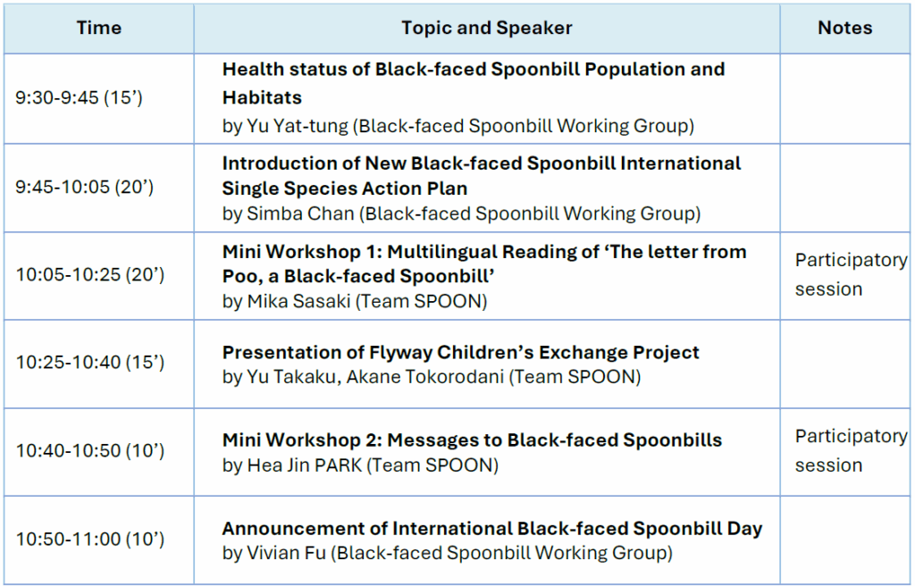 The session will conclude with the announcement of the International Black-faced Spoonbill Day, a new platform to unite Flyway partners and inspire public engagement across East Asia.