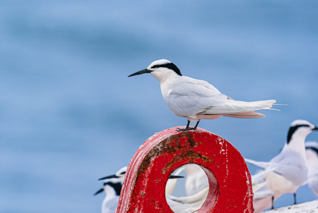 The Black-naped Tern is a small to medium-sized tern species, distributed mainly in Tropical Indian and Pacific Oceans. It has distinctive for its white plumage except with a black band from the eyes, which continues in broadening to the nape. It contains two subspecies: S.s. sumatrana and S.s. mathewsi.