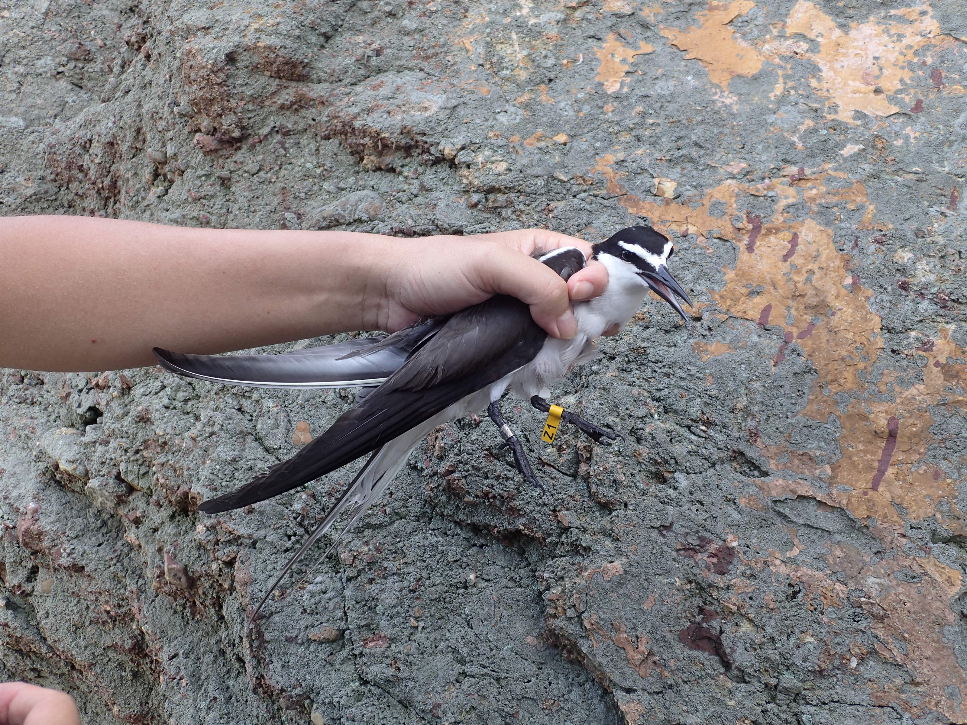 The Hong Kong Bird Watching Society (HKBWS) has started a conservation research on breeding terns in Hong Kong waters. In summer 2019, a total of 110 adult and juvenile Bridled Terns Onychoprion anaethetuswere trapped for marking with rings and colour flags (white and yellow engraved flags), including two of them fitted with satellite-tracking transmitters. Marking the terns can shed light of some valuable ecological information such as local movements, home range of breeding terns, long-distance migration and longevity. Migration routes and wintering grounds of the Hong Kong breeding terns are still unknown.