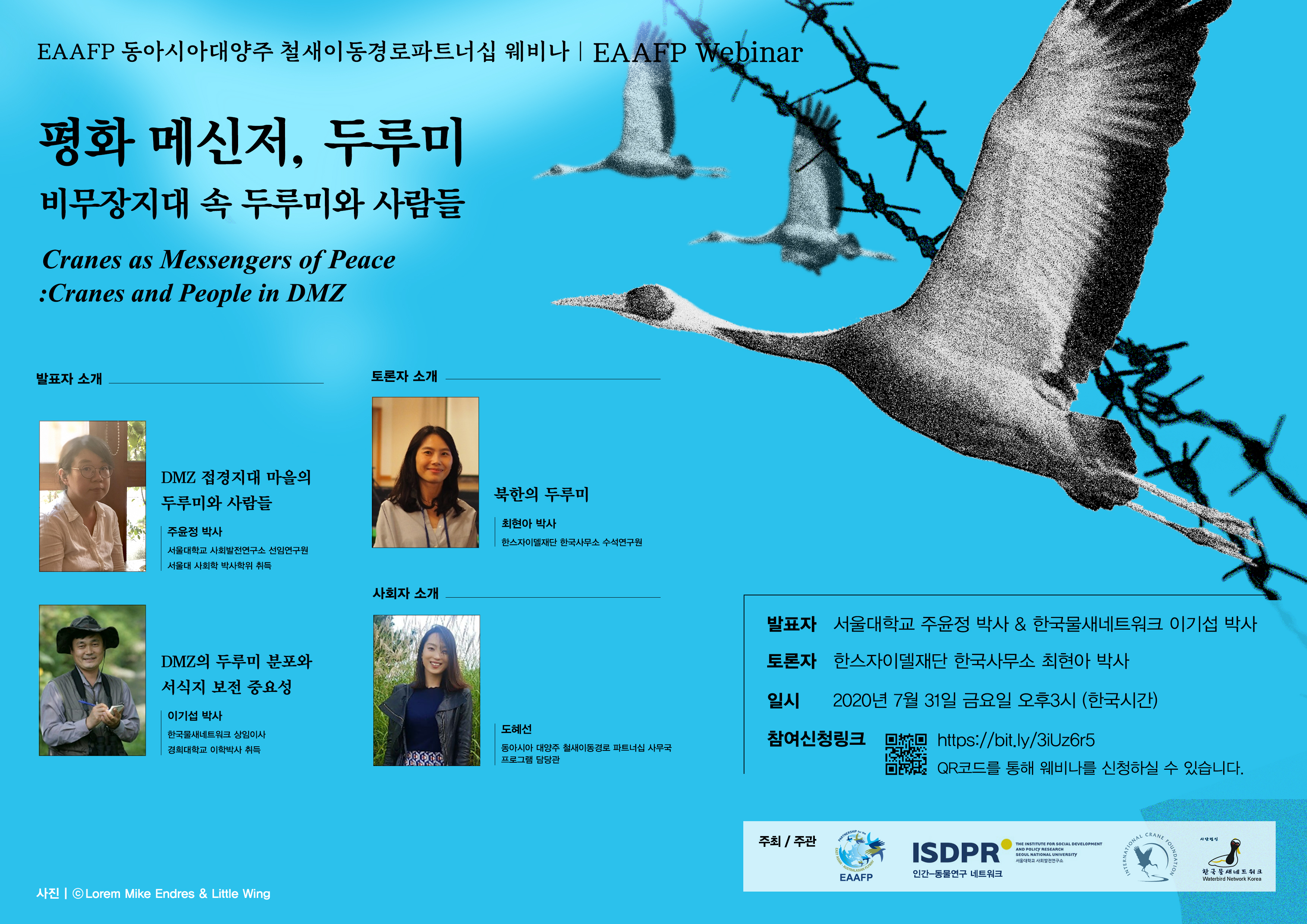 With the topic of “Cranes as Messengers of Peace – Cranes and People in DMZ”, East-Asian Australasian Flyway Partnership is honored to invite Dr. Joo Yunjeong from The Institute for Social Development and Policy Research, Seoul National University, Dr. Lee Kisup from Korean Waterbirds Network, and Dr. Hyunah Choi from Hanns Seidel Foundation.