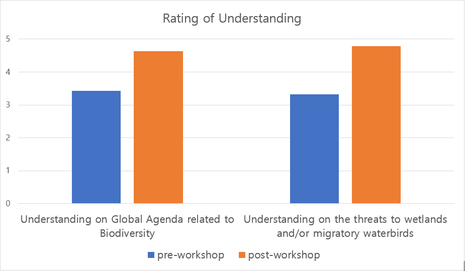 From the questionnaire of the workshop, out of 14 participants who took part in the pre- and post-workshop surveys, all of them had an increase of Understanding on Global Agenda related to Biodiversity, as well as the threats to wetlands and migratory waterbirds (Fig.1). All of them are satisfied with the workshop, in which 50% of them marked the workshop was above their expectation.