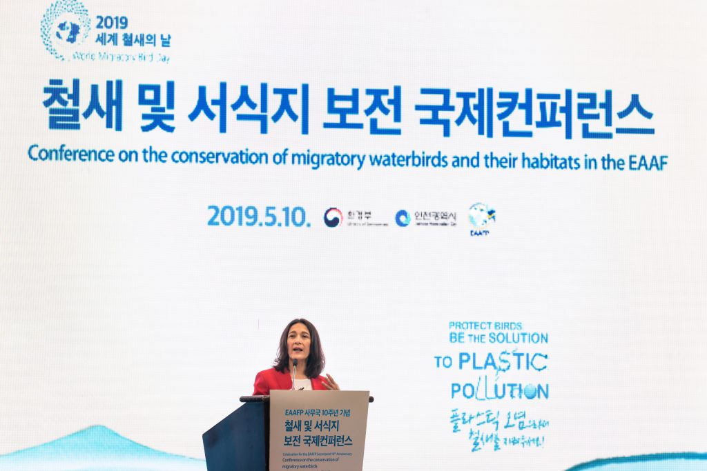 Our second keynote speaker was Ms. Martha Rojas-Urrego, Secretary General of the Ramsar Convention on Wetlands, as one of EAAFP official Partners (EAAFP is a Ramsar Regional Initiative). Ms. Rojas-Urrego began her presentation by showing news headlines of natural disaster related to climate change. This really struck a chord with the audience since it showed the prevalence of these disasters and the scale of the destruction caused by them. Ms. Rojas-Urrego continued to illustrate the importance of wetlands for protecting the shore from disaster risk. As an intergovernmental treaty for the protection and wise use of wetlands, established in 1970, Ramsar Convention has designated over 2,200 wetlands of international importance. Ms. Rojas-Urrego then highlighted the fact that over 40% of migratory species reside in wetlands, and thus it is important to conserve these species by protecting the wetlands. Another example of the enormous role of peatlands, as a type of wetlands, in the process of carbon sequestration, for peatlands can sequester around 30% more CO2 than all the forests in the world. Also, another ecosystem service provided by wetlands is natural water purification, which crucially important because globally, 80% of wastewater goes to wetlands. In addition, over 1 million people in the world depend on wetlands for their livelihoods. With increasing demand, it is almost inconceivable to the fact that we are losing our wetlands 3 times faster than our forest. In Ms. Rojas-Urrego closed her speech by emphasizing the need to put wetlands conservation as the focus of development.