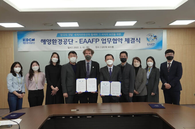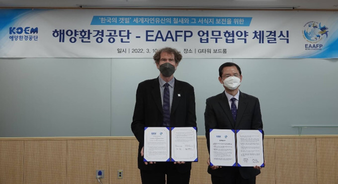 Korea Marine Environment Management Corporation (KOEM) signed a Memorandum of Understanding (MoU) with the EAAFP Secretariat at G-Tower, Songdo on 10th March 2022. The agreement aims to facilitate each institution’s cooperation on the conservation of habitats and associated migratory waterbirds about the Outstanding Universal Value (OUV) acknowledged by the UNESCO World Natural Heritage.