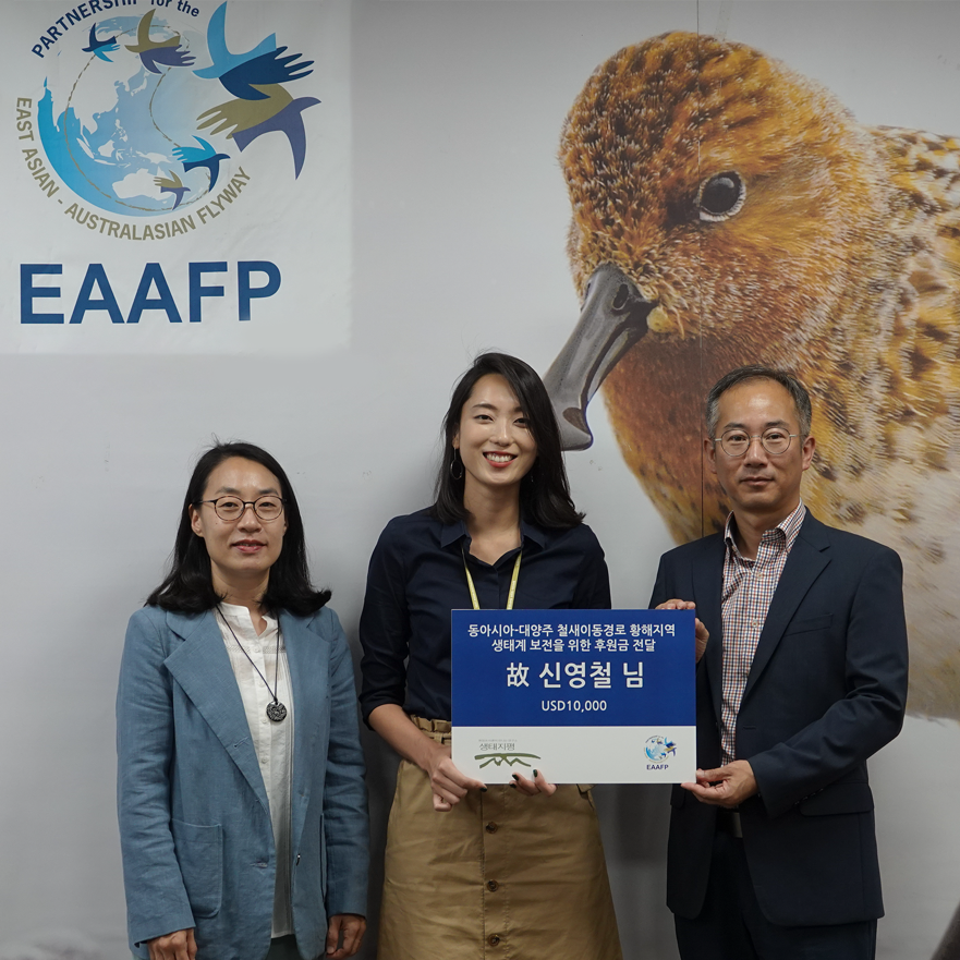생태지평은 지난 8월 13일 인천 송도에 위치한 동아시아-대양주 철새이동경로 파트너십 (EAAFP) 사무국에서 총 10,000달러의 발전 기금을 전달했다. 전달식에는 고(故) 신영철님의 유증 전달을 위해 명호 부소장과 장지영 사무처장이 참가하였다.