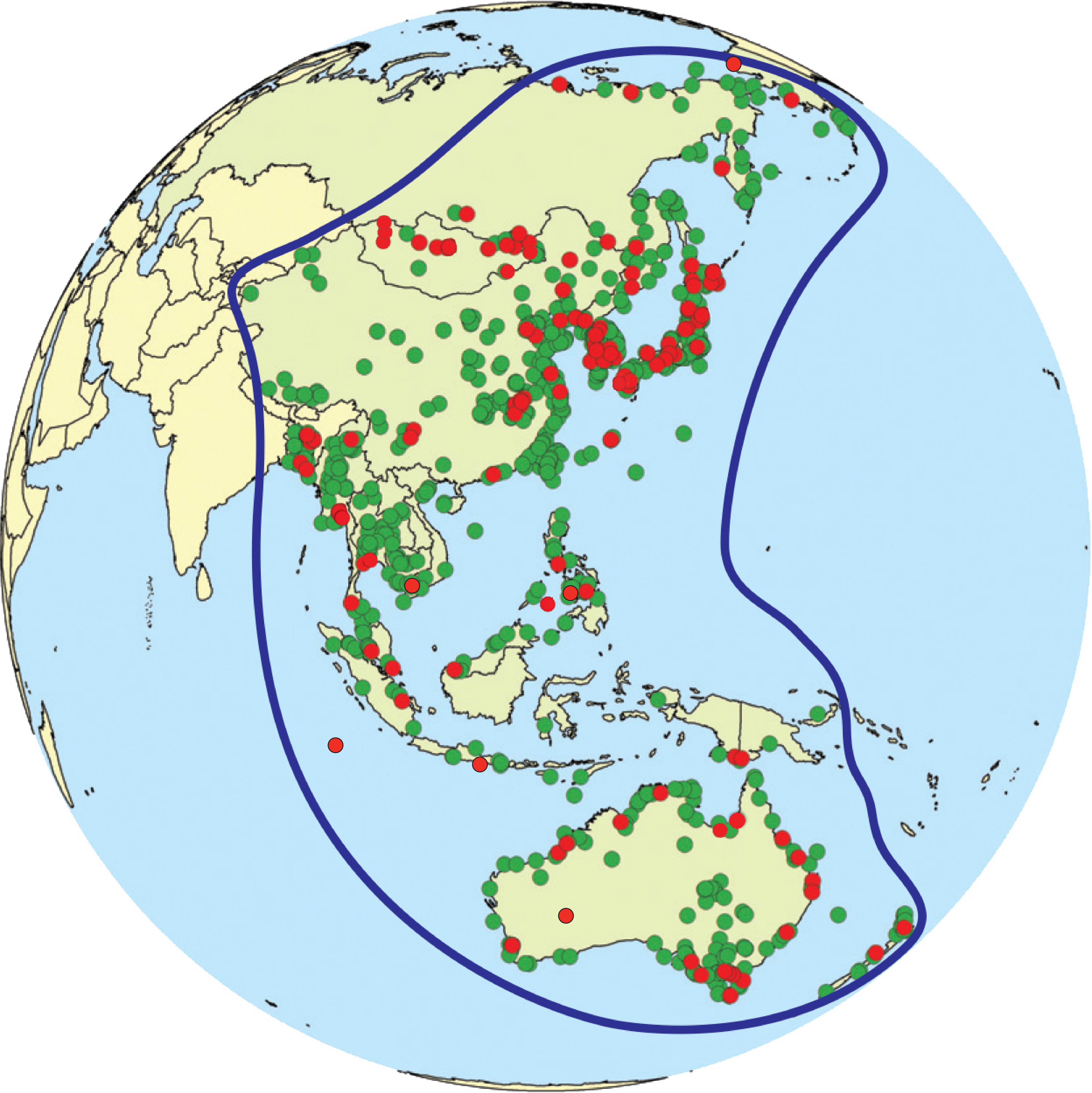 Green dots indicate important sites for migratory waterbirds and red dots indicate sites in the Flyway Site Network.