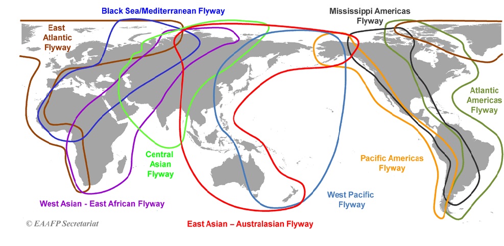 The routes that migratory waterbirds traverse on an annual basis are known as 'flyways'. This map is largely based on Shorebird routes.