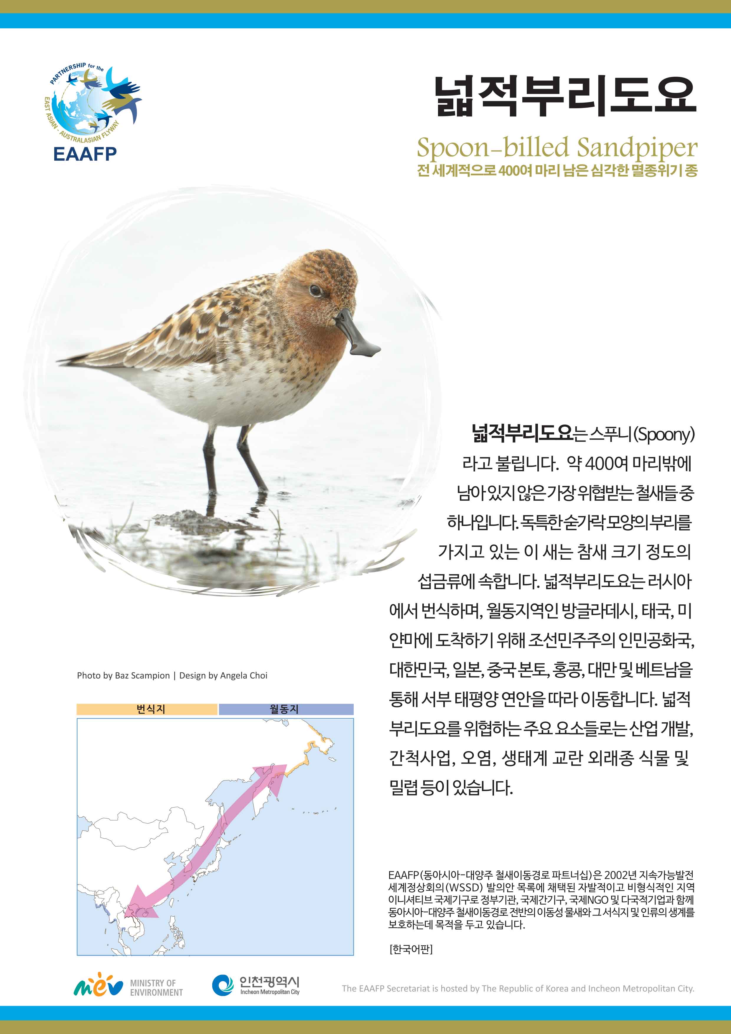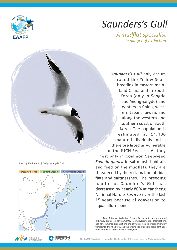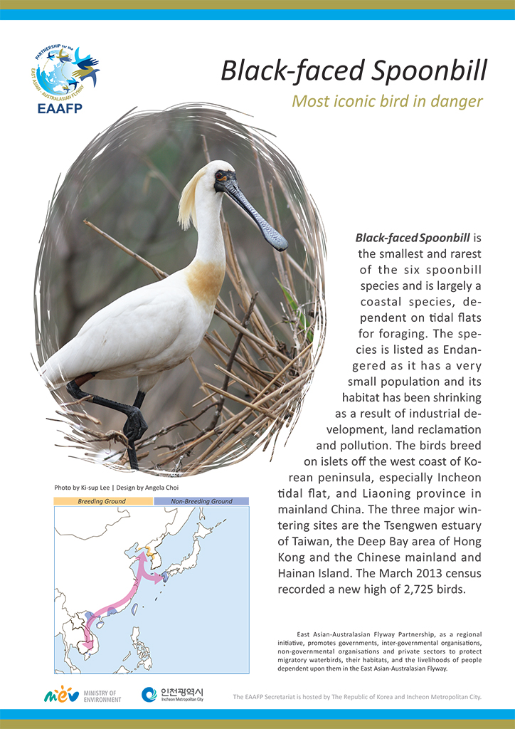 Here are five major species flyers of Spoon-billed Sandpiper, Saunders’s Gull, Black-faced Spoonbill, Bar-tailed Godwit and Far Eastern Curlew with their general species information and migration.
