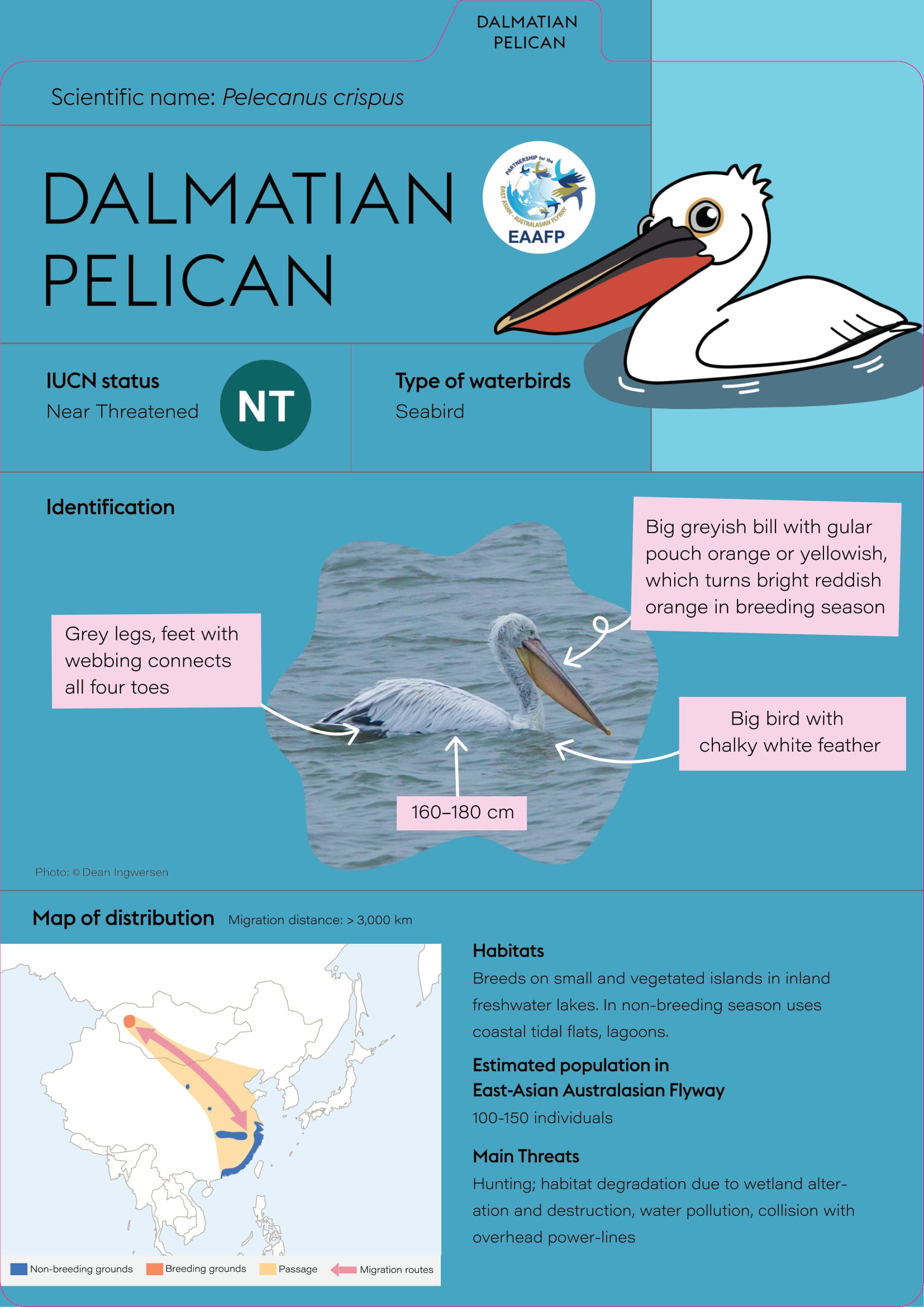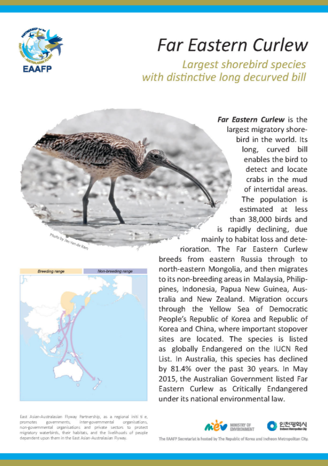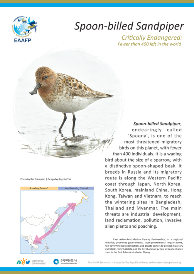 Here are species factsheets of Spoon-billed Sandpiper, Saunders’s Gull, Black-faced Spoonbill, Bar-tailed Godwit, Far Eastern Curlew, Dalmatian Pelican, Scaly-sided Merganser, and Baer's Pochard.