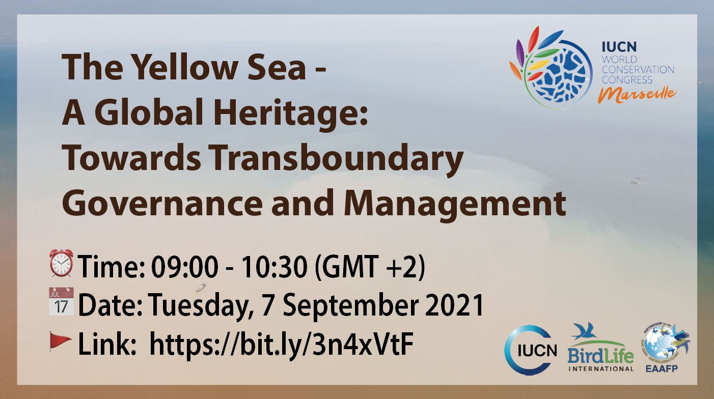 EAAFP Partners engaged in the Congress covering relevant themes under ‘freshwater’, ‘oceans’ ‘climate change’, and ‘rights and governance.’ (https://eaaflyway.org/eaafp-partners-engagement-at-iucn-wcc-2020/)  On 7th Sept (Tues), IUCN in collaboration with Birdlife International and EAAFP Secretariat held ‘the Yellow Sea-A Global Heritage: Towards Transboundary Governance and Management’ side event. Following the 2016 Resolution 26 on “Conservation of intertidal habitats and migratory waterbirds of the EAAF, especially the Yellow Sea, in a global context” the side event focused on strengthening transboundary conservation in the Yellow Sea region, shared by People’s Republic of China (PRC), Democratic People’s Republic of Korea (DPRK), and the Republic of Korea (RoK).