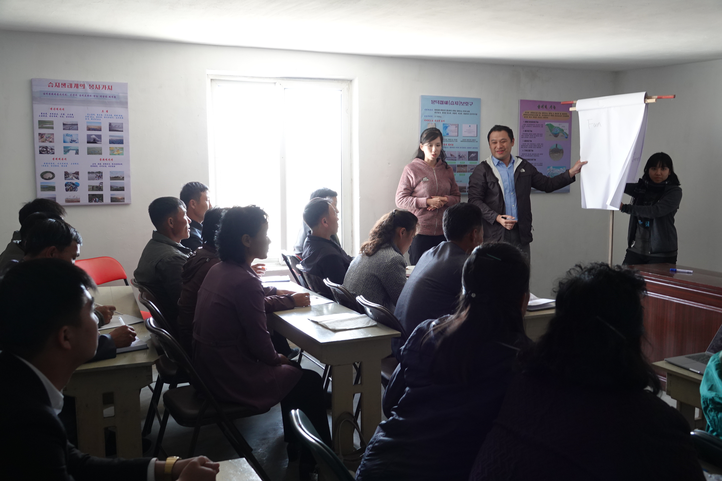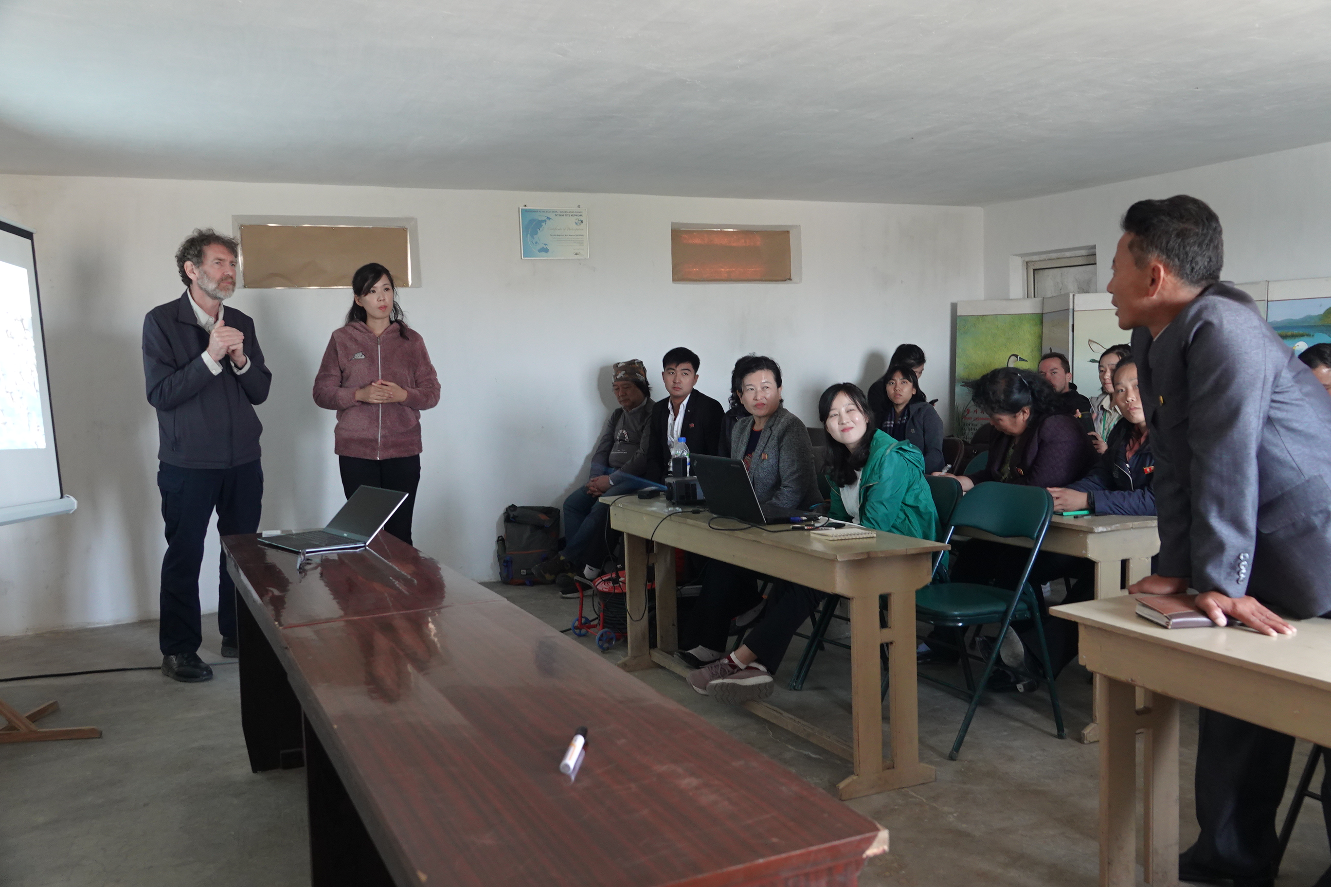 From 14th to 16th Oct, a training workshop was conducted for site managers from Mundok, Kumya Migratory Bird Reserves (both EAAFP Flyway Network Sites, EAAF 045 and EAAF 044) and Rason Migratory Bird Reserve (Ramsar Site), as well as local teachers. The training topics covered concepts of wetland management, CEPA and environmental education, basics of bird identification and monitoring. The trainers were from EAAFP Secretariat and Science Unit, EAAFP Crane Working Group, WWF- Hong Kong and Mangrove Foundation (MCF).
