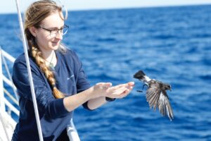 Photo of her releasing a New Zealand storm petrel @Jochen Zaeschmar