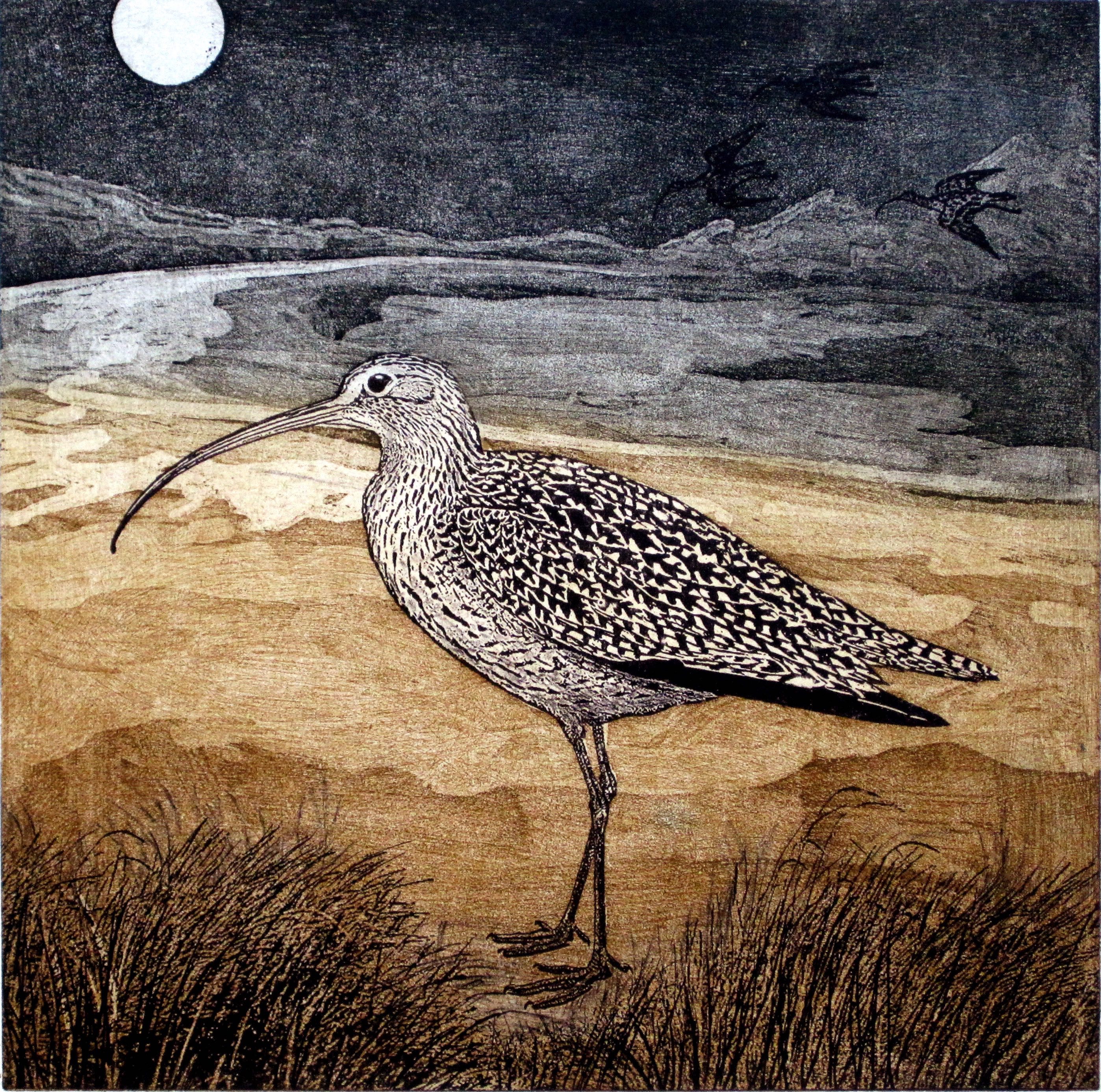 Kate: I’m Kate Gorringe-Smith and I am from Melbourne, Victoria in Australia. I first studied English and Zoology at university, which won me a job as assistant editor at BirdLife Australia. While there I pursued my other passion, art, gaining a degree from Melbourne’s Royal Melbourne Institute of Technology in printmaking. I’ve made prints ever since, mainly linocuts and etchings. For the last decade or so I have run a number of environmental art projects to raise awareness of migratory shorebirds, the East Asian-Australasian Flyway (EAAF), and the challenges they face.