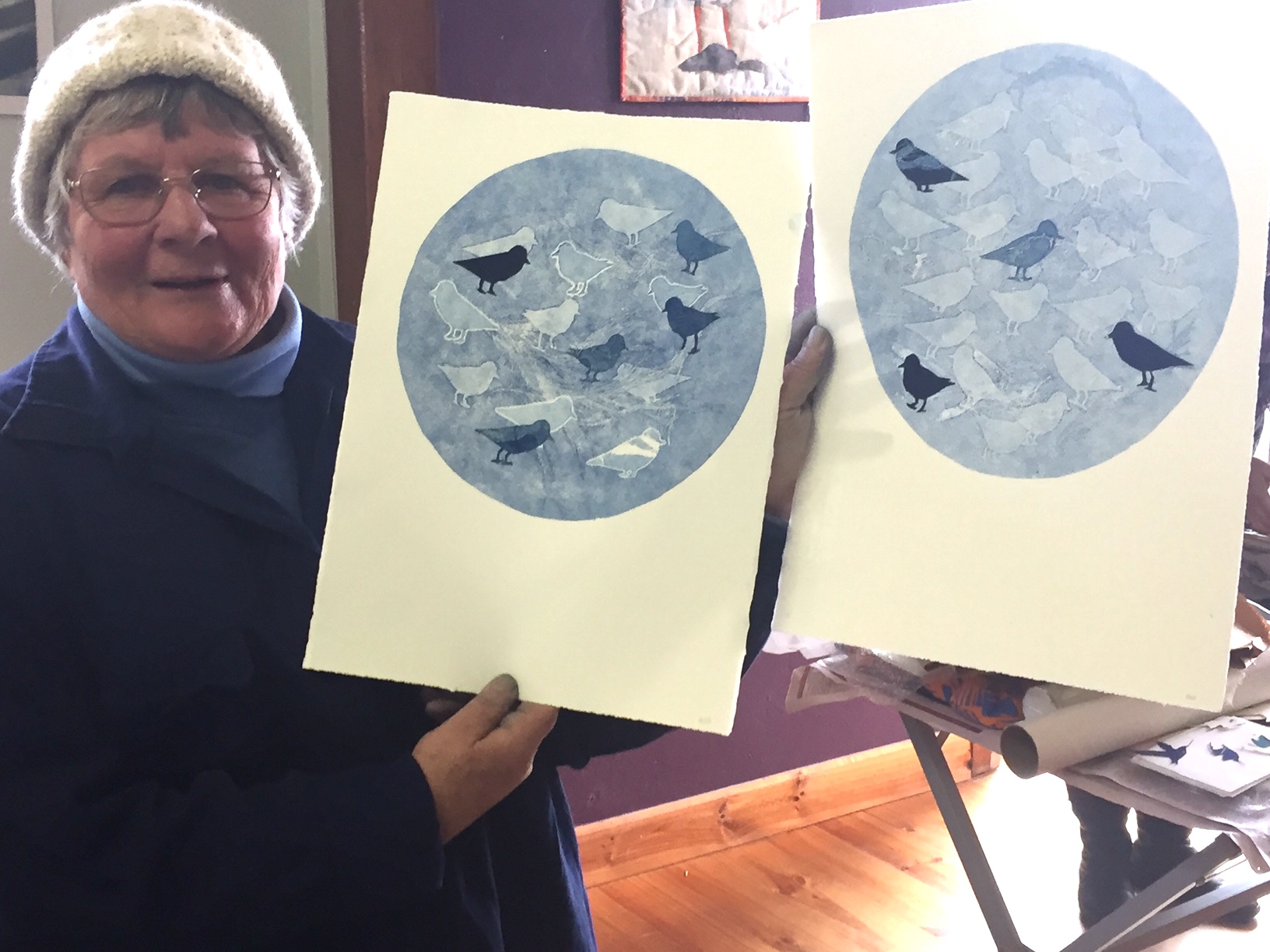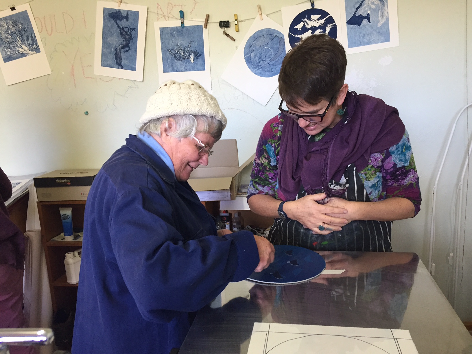 Kate and Margaret Bennett at an Overwintering printmaking workshop on King Island, Tasmania (photo © Kate Gorringe-Smith)