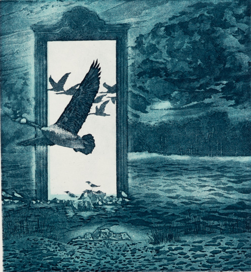![]() Kate Gorringe-Smith, 2019, Altona Stint, linocut on ecoprint | ![]() Annie Day, 2017, Time to Go, etching and lithograph. |
