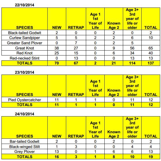 The catches gave us some long-lived individuals (note that e.g. 13+ means the bird is a minimum age of 13 and may well be older). We caught a Red Knot age 16+, Curlew Sandpiper age 13, Great Knots age 19+, 18+, 16+, 15+, 14, 12+ and one at 13 years old that is now carrying a transmitter. Bar-tailed Godwits age 19+ and 14+ the 19+ bird is carrying a transmitter. And a Pied Oystercatcher aged 15 years old.