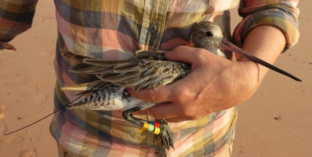 We had difficulty to catch the required Bar-tailed Godwits we needed, but on 29 October we finally made a very nice catch despite one cannon malfunctioning and not firing. The catch contained lots of adult female Bar-tailed Godwit, the age and sex we were wanting for the satellite project. No Bartailed Godwit were used for the personality experiment. Knots are relatively easy to keep but godwits are not. The Bar-tails were given their satellite transmitters at the catch site and released immediately.