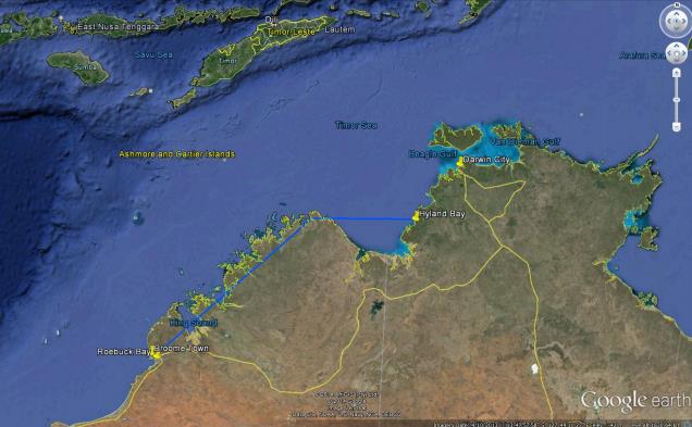 The other one surprised us considerably more as it suddenly decided to take off and fly directly to the eastern side of the Joseph Bonaparte Gulf to a mudflat and river mouth at Hyland Bay in the Northern territory. This is 912 km in a direct flight from Roebuck Bay but we know that the bird flew along the coast as it was transmitting during some of the flight, so it probably did over 1,00km to get to its new ‘home’. The obvious questions spring to mind, will it stay there (google earth and information from Ray Chatto tell us the area is perfect for knots, undisturbed with large inter-tidal mudflats.) If it migrates north successfully will it return next September to Roebuck Bay or straight back to Hyland Bay?