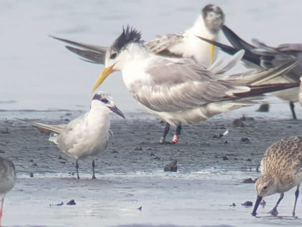 The Greater Crested Tern is a large-sized tern species distributed in tropical and subtropical Old World, usually nesting in dense colonies in coastal islands. There are four subspecies recognized: Thalasseus bergii bergii, Thalasseus bergii thalassinus, Thalasseus bergii velox, Thalasseus bergii cristatus, with T.b. cristatus found within the EAA Flyway.