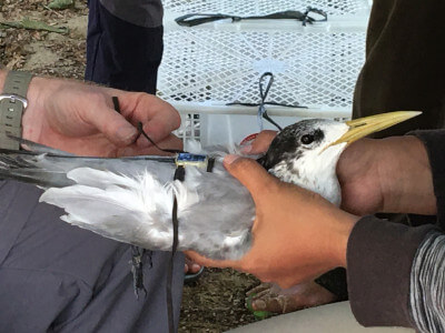 ![]() Mr. Yu Yat Tung, Research Manager of HKBWS released a Greater Crested Tern fitted with a satellite transmitter in the wintering island of Indonesia © HKBWS | ![]() Greater Crested Tern fitted with satellite transmitter in Indonesia © Simba Chan |