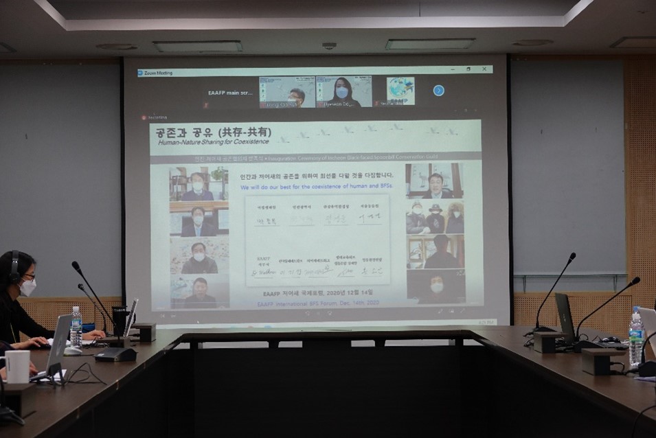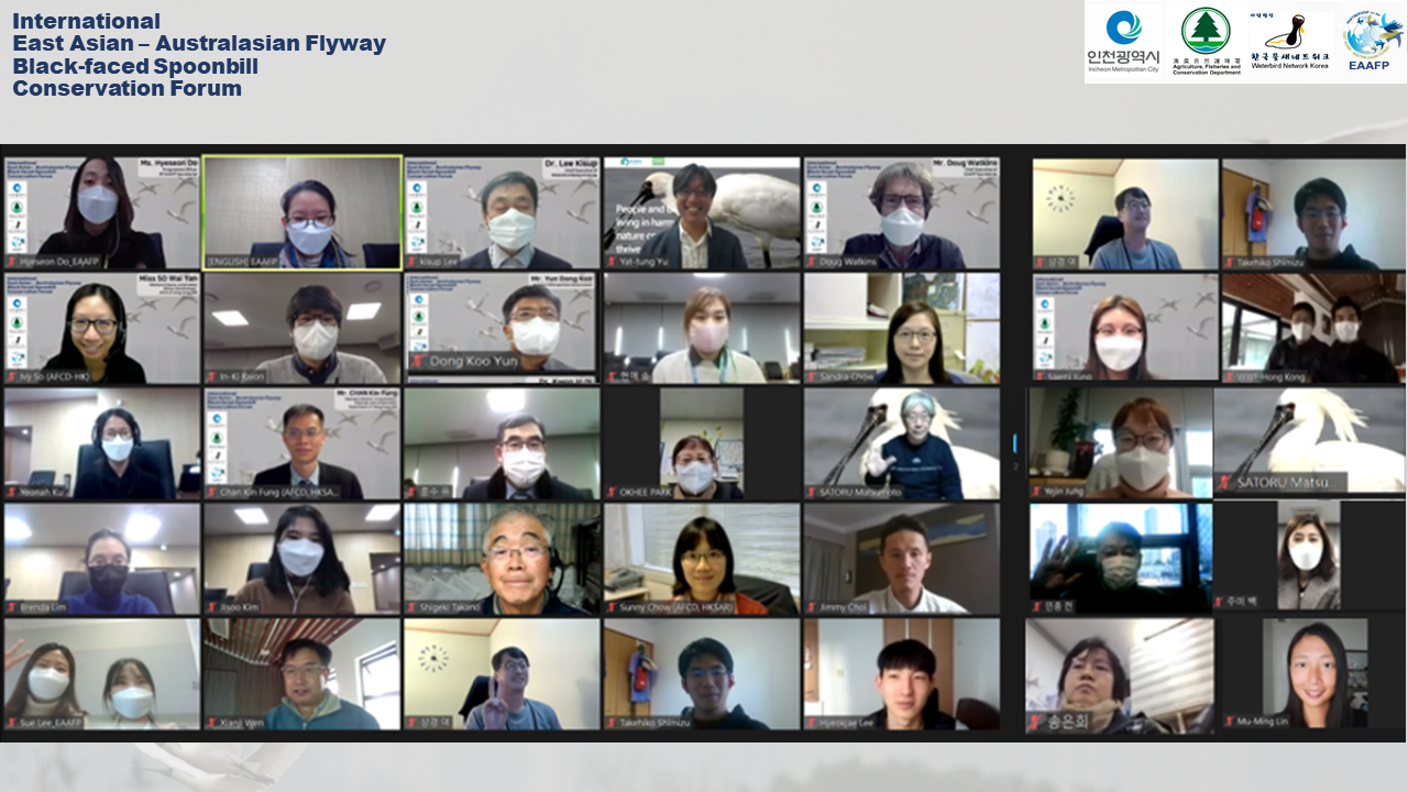 To follow up with the Sister Site Agreement between Incheon Metropolitan City, Republic of Korea (Ro Korea) and Hong Kong Special Administrative Region, People’s Republic of China, signed in 2019, On 14 December 2020, an International East Asian-Australasian Flyway Black-faced Spoonbill (BFS) Conservation Forum: Cooperation between Incheon-Hong Kong on Conserving Migratory Waterbirds and Their Habitats was held virtually (programme: https://eaaflyway.org/ic-hk-bfsforum/) . The event was co-hosted by the Environment Bureau of Incheon Metropolitan City Government and the Agriculture, Fisheries and Conservation Department (AFCD) of Hong Kong Special Administrative Region (SAR) and organized by the EAAFP Secretariat. Over 50 participants including gov’t officials, local NGOs, experts and researchers also joined the meeting.