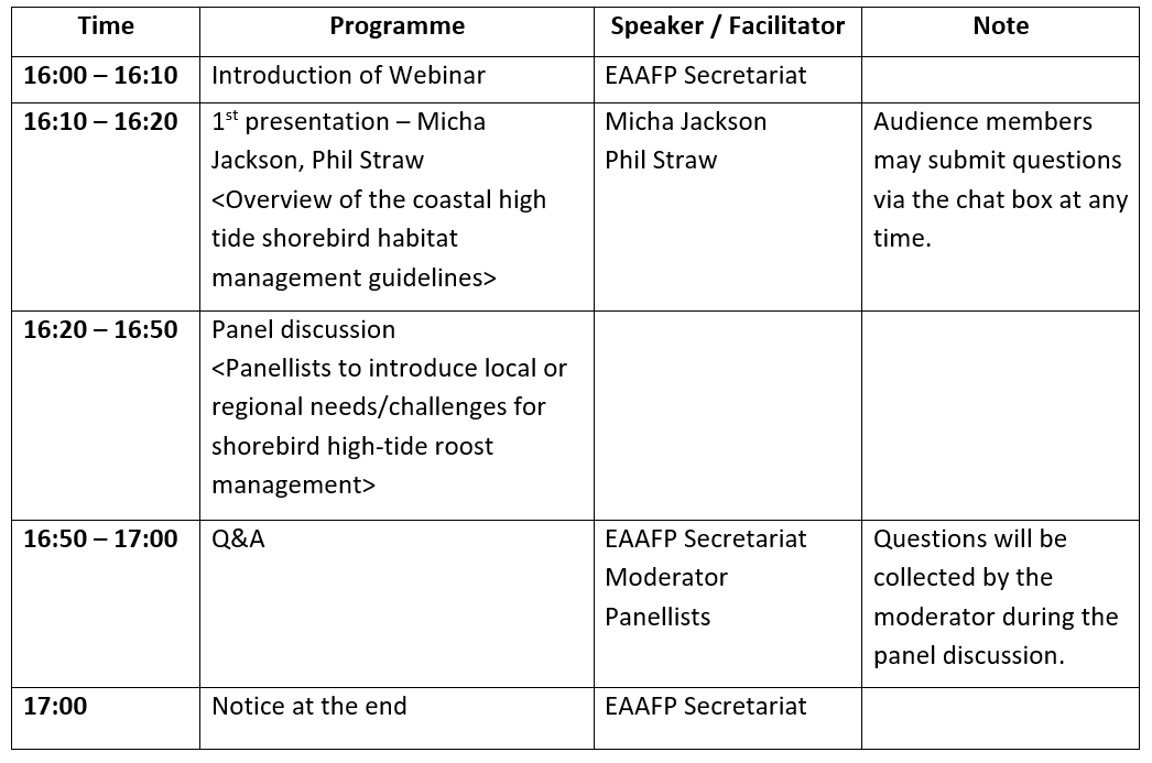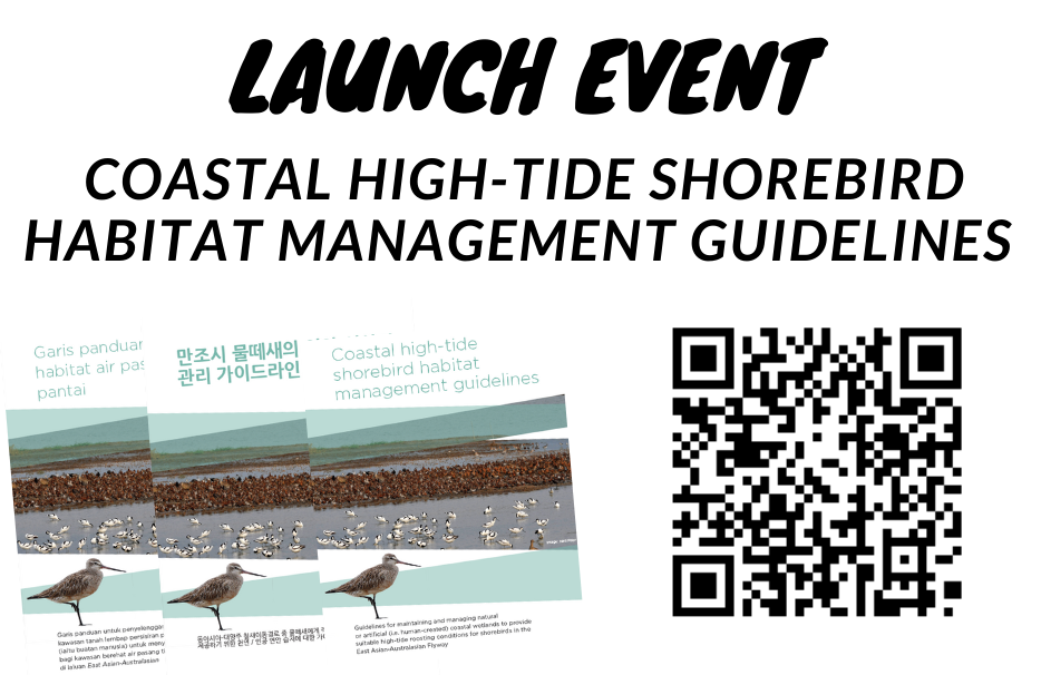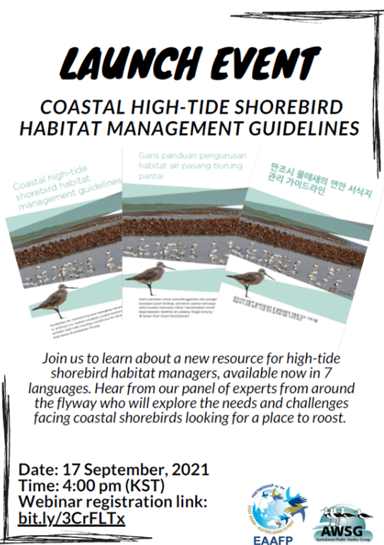 The EAAFP Secretariat, together with the Australasian Wader Studies Group are hosting a webinar “Launch Event: Coastal High-tide Shorebird Habitat Management Guidelines” on 17 September at 4pm – 5pm (KST). The editors of the guidelines will provide an overview of their content and the collaborative, evidence-based process used to develop the guidelines. A panel of experts, many of whom supported translation of the guidelines, will then discuss local/regional needs and challenges facing high-tide habitat managers in the flyway.