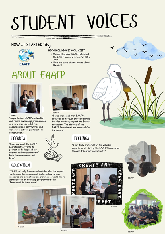 “At the EAAFP Secretariat, I gained confidence that I could achieve my dream of becoming a business manager contributing to the environment … The visit to the EAAFP Secretariat, where I gained new insights and courage along with knowledge about migratory birds, will be an unforgettable memory in my high school life.”