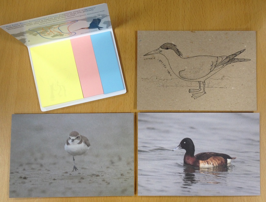 To introduce EAAFP’s works and some threatened migratory waterbirds to public, EAAFP Secretariat made post-it and postcards of Baer’s Pochard and Chinese Crested Tern, both are categorised as Critically Endangered on the IUCN Red List, and one-legged Kentish Plover highlighting injuries from fishing debris. The postcards were printed on 100% recycled paper. The Chinese Crested Tern postcard (top right) was produced for colouring on recycled cardboard paper, with an artwork of previous intern Mr. David Broughton. If you are interested in these items, please contact us at secretariat@eaaflyway.org .