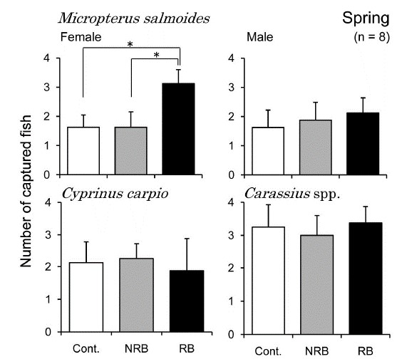 3. In the non-spawning season, the female largemouth bass did not show any preference for RB. Other fish species did not show any preference for RB in both the spawning and non-spawning season.