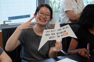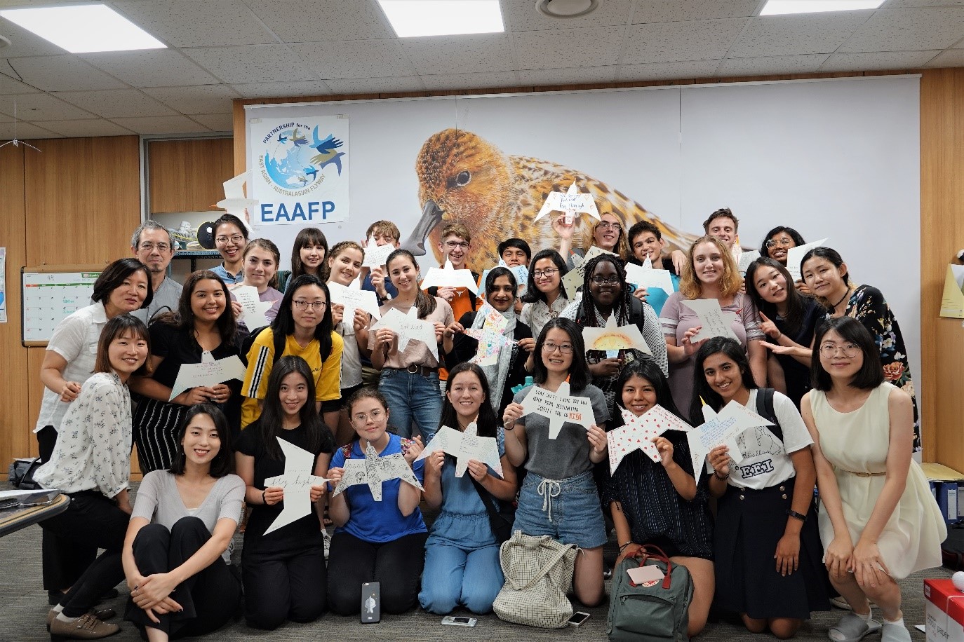 Lew Young, Chief Executive of EAAFP, gave a closing remarks for the students. “How are you going to tell what you’ve learned here to your eight-year-old sister?” he started with this question. He also mentioned the importance of conserving flyway reaching to Alaska as well. With the hope they will push an effort on conservation activities in the near future, we took a photo with Spoon-billed Sandpiper at the office.