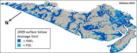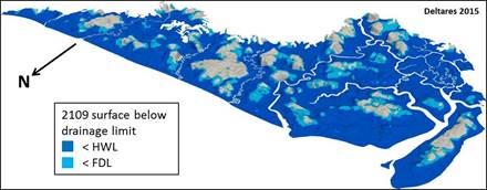 Three-dimensional Digital Terrain Model of the Rajang delta in 2009 and 2109 with the surface below drainage limited projected in blue. © Wetlands International 2014