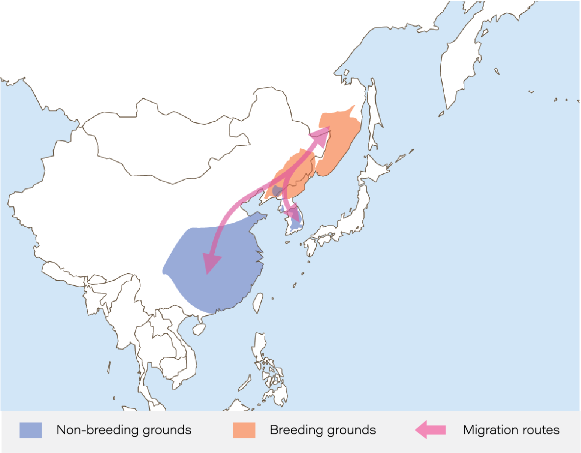 Breeding grounds: breeds primarily in South East Russia, North-east China, and DPR Korea
