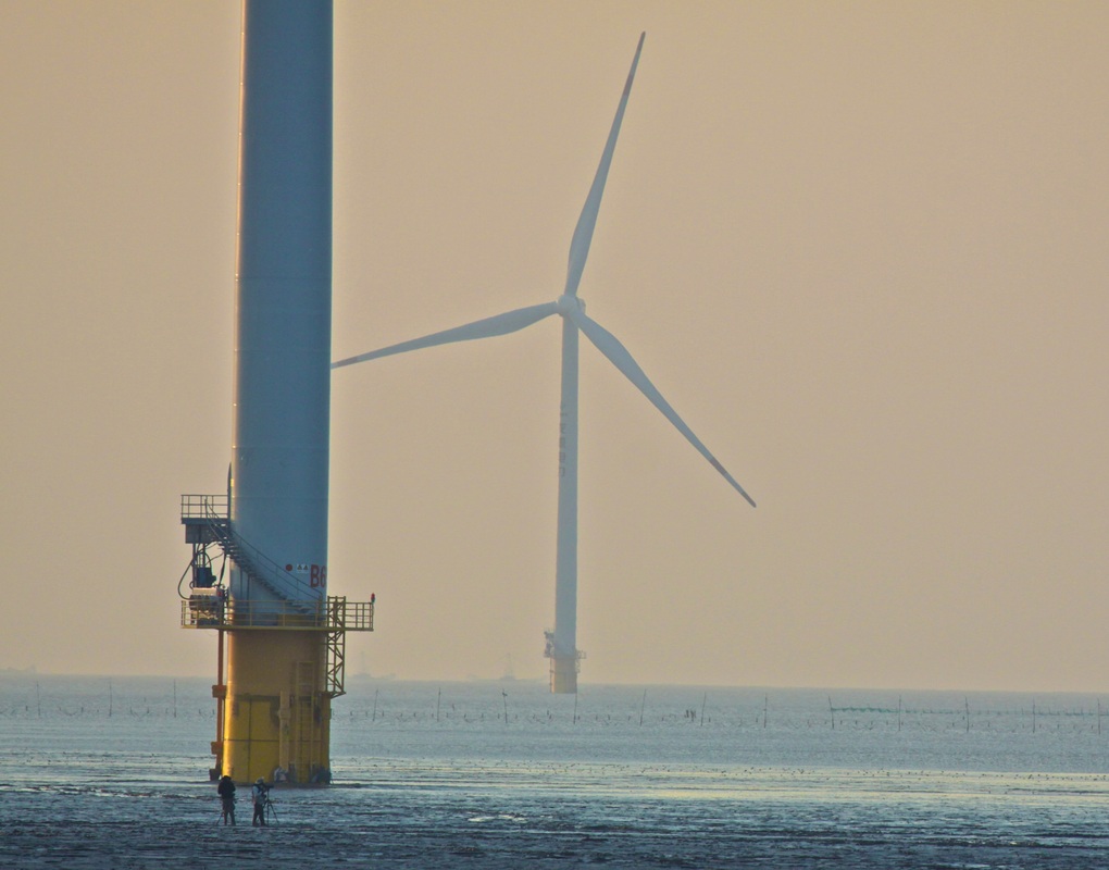Giant Turbines cross the landscape and stretch far out into the Yellow Sea dwarfing us on the mudflats