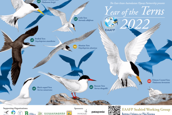 2022 Year of the TernsIntroduction: There are over 150 seabird species in the East Asian – Australasian Flyway (EAA Flyway). Many of them spend most of their lives in offshore oceans and have long trans-equatorial migration routes, only coming to land during the breeding season. This makes it especially difficult to study seabirds, and most species remain understudied in the EAA Flyway. Furthermore, while some species have large populations, many others face the risk of extinction and population decline due to various threats such as offshore fishery practices, and invasive species on islands; some of which are specific to seabirds. To raise awareness among EAAFP Partners, researchers, conservationists, and the general public, while promoting the exchange of information and collaboration on seabird species in the EAA Flyway, the EAAFP and the Seabird Working Group initiated the Year of the Terns in 2022. Out of the 16 tern species in the EAA Flyway, seven species were selected: Chinese Crested Tern (CR), Aleutian Tern (VU), Greater Crested Tern, Bridled Tern, Little Tern, Black-naped Tern and Roseate Tern. Stay tuned for the upcoming activities, and all are invited to support us in the Year of the Terns! Learn about Terns in EAA Flyway (factsheet) (coming soon) EAAFP Year of the Terns Photo Competition Talk series At World Seabird Day Winner of 2022 “Year of the Terns”[The Best Photo of Tern Species] Photographer: Haocheng Wang Species: Chinese Crested Tern Date of photo taken: 18 August 2022 Location: Jiaozhou Bay, Qingdao, China[Tern Photo With the Best Conservation Message] Photographer: Erickson A. Tabayag Species: Sooty Tern Date of photo taken: 29 July 2022 Location: Lawak Island, Municipality of Kalayaan, Palawan, The Philippines[Most Voted Photo] Photographer: Le Manh Hung Species: Bridled Tern Date of photo taken: 18 May 2022 Location: VietnamMeet the "Year of the Terns" Photo Contest Judging Panel and learn their stories for conserving seabirds in EAA FlywayMs. Angelique Songco Click hereProf. Dan Roby Click hereDr. Kiyoaki Ozaki Ms. Edin Whitehead Mr. Yat-tung Yu Tern of the Month Chinese Crested Tern Aleutian Tern Little Tern Bridled Tern White-winged Tern Roseate Tern Black-naped Tern Greater Crested TernTern species list for the EAA FlywaySpeciesCommon NameIUCN statusThalasseus bernsteiniChinese Crested TernCRSterna acuticauda Black-bellied TernENChlidonias albostriatusBlack-fronted TernENSternula nereis Fairy Tern VUOnychoprion aleuticusAleutian TernVUSterna aurantiaRiver TernVUGelochelidon niloticaGull-billed TernLCHydroprogne caspiaCaspian TernLCThalasseus bengalensisLesser Crested TernLCThalasseus bergiiGreater Crested TernLCSterna dougalliiRoseate TernLCSterna striataWhite-fronted TernLCSterna sumatranaBlack-naped TernLCSterna hirundoCommon TernLCSterna paradisaeaArctic TernLCSternula albifronsLittle TernLCOnychoprion lunatusGrey-backed TernLCOnychoprion anaethetusBridled TernLCOnychoprion fuscatusSooty TernLCChlidonias hybridaWhiskered TernLCChlidonias leucopterusWhite-winged TernLCGygis albaWhite TernLCSterna vittataAntarctic TernLCAnous stolidusBrown NoddyLCAnous minutusBlack NoddyLCAnous tenuirostrisLesser NoddyLCGelochelidon macrotarsaAustralian TernLCSupporting Organizations:Sponsors:For inquiries: Ms. Vivian Fu Communication Officer, EAAFP Secretariat Email: communication@eaaflyway.org * Illustration and visual design by Ayuwat Jearwattanakanok News about terns in EAAFWebinar on Chinese Crested Tern in the Yellow Sea and Seabird Conservation in ChinaBlack-naped TernWhite-winged TernGreater Crested TernRoseate TernBridled Tern11th Yakutat Tern FestivalLittle TernAleutian Tern“Year of the Terns” Flyway Story Series #16 – Prof. Daniel Roby, Seabird researcher and conservationist