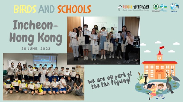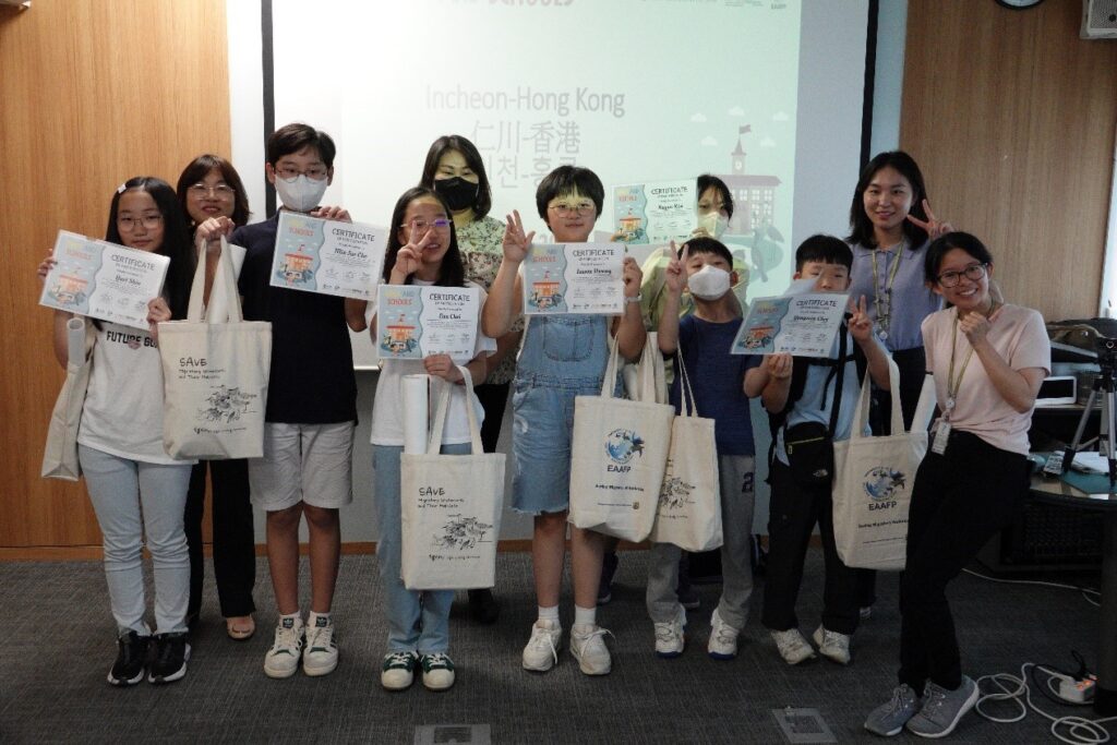 The second “Birds and Schools” event was held on 30th June, 2023, 30 primary school students from Incheon, Republic of Korea and Hong Kong, China, participated. The event was co-organized by Black-faced Spoonbill Eco Centre in Incheon and Hong Kong Wetland Park and the EAAFP Secretariat. The event is part of the CEPA programme under the Incheon-Hong Kong Sister Site Programme.