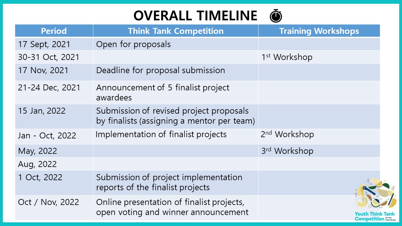 Deadlines of registration: 2 Nov, 2021 (23:59 KST)Details and eligibility: https://eaaflyway.org/think-tank-competition-1st-workshop/ Target Audience