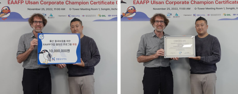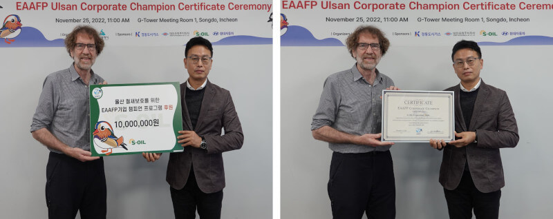 지난 11월 25일, 울산 기업 챔피언 프로그램의 첫 해를 맞아 G타워 본동 8층 회의실에서 울산기업챔피언 인증서 수여식이 진행되었다. 2021년 5월, EAAFP 사무국과 양해각서 (MOU)를 체결한 울산광역시와 울산기업 4개사(현대자동차㈜, S-OIL㈜, 대한유화㈜, ㈜경동도시가스)가 참여하였다. 울산 기업챔피언 프로그램은 동아시아-대양주 철새이동경로의 이동성 물새와 서식지의 생태보전에 기여하는 기업의 공헌을 국제적으로 인증하는 EAAFP 기업챔피언 프로그램의 일종이다. 참여기업은 울산에 서식하는 철새 1종을 선정해 해당 종과 그 서식지를 보호하는 홍보대사, 즉 철새챔피언으로서 활동하게 된다.